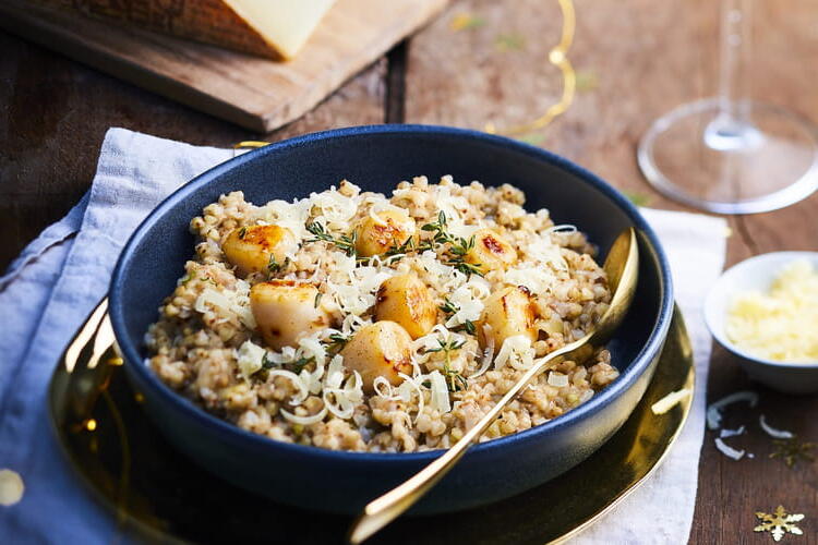Enjoy this buckwheat risotto with scallops and aged cheese.