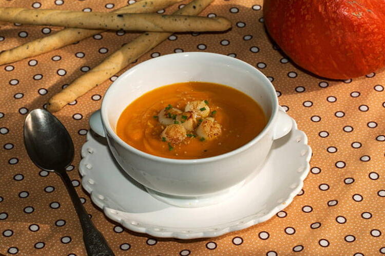 Melt the chopped shallot in olive oil in a pot. Add the pieces of squash and sauté them lightly. Cover with broth. Season with salt and pepper and cook for about 30 minutes.