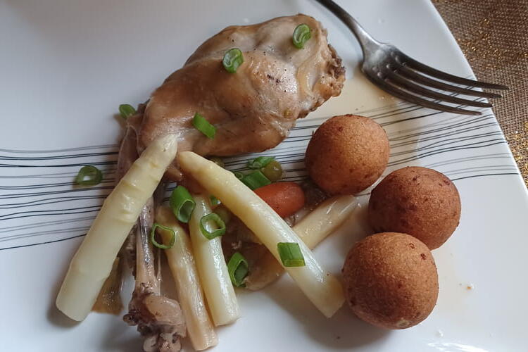 A recipe with Asian flavors, sautéed chicken with cashews. If, like us, you don’t have Chinese yellow wine, white wine or even beer will do the job.