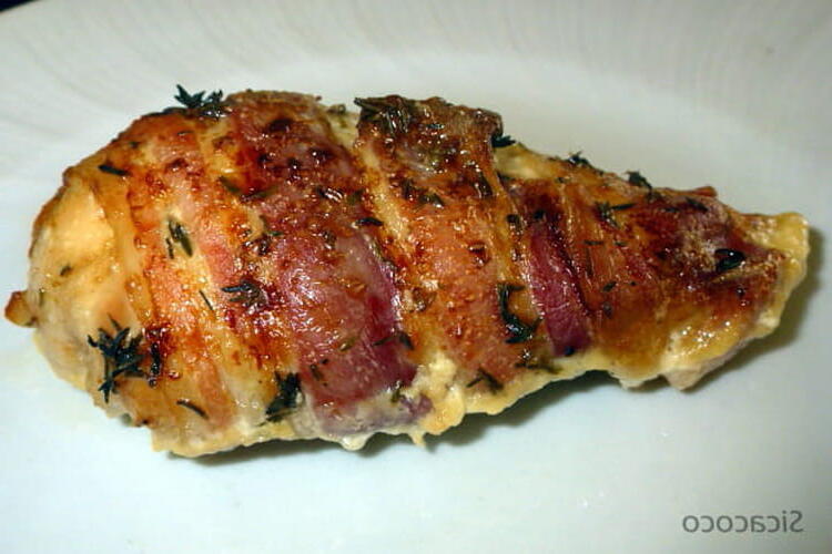 Generously brush the fillets with mustard, wrap them in thin slices of smoked bacon (tightly) and season with pepper. Place them in a baking dish, sprinkle fresh thyme over the fillets, and add 100 ml of liquid cream.