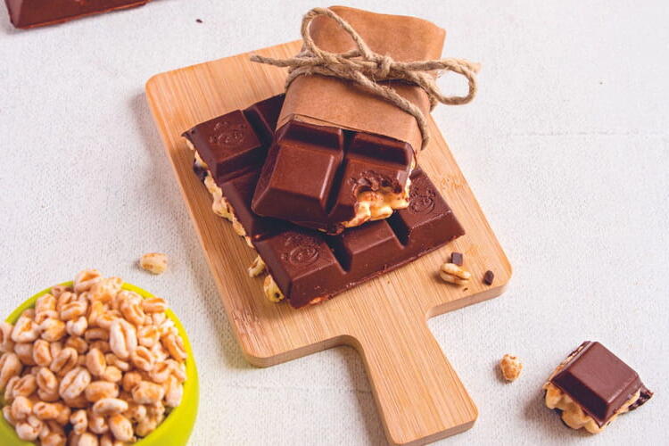 Spread the white chocolate and cereal mixture into the cavities of the mold. Let set in the freezer for 30 minutes. Melt the other half of the milk chocolate and pour it into the cavities. Reserve in the refrigerator until the chocolate hardens, then unmold.