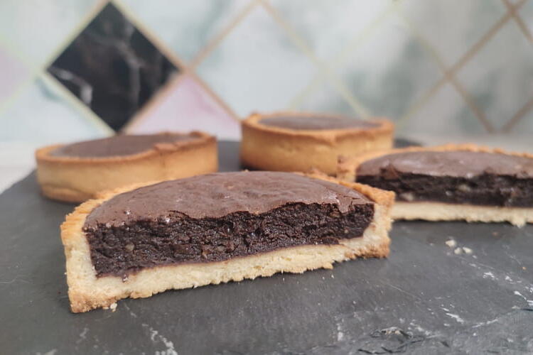 To finish, melt the chocolate with a bit of liquid cream in the microwave. Add the eggs, the liquid cream, then the ground hazelnuts and mix well. Pour the mixture into a piping bag. Once the tartlet bases are baked, pipe the chocolate cream inside. Bake the tartlets again for 6 minutes at 180 degrees.