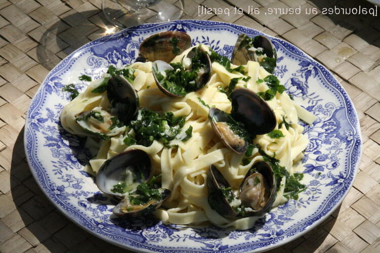 Cooking the clams In a pan, melt the butter and add the parsley and garlic. Stir for a moment, then add the clams. Cover and let cook for a few moments until the clams open.