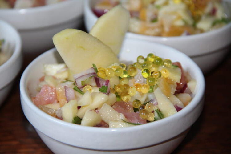 To finish, place drops of lemon juice and two slices of apple on each small dish. ENJOY YOUR MEAL!