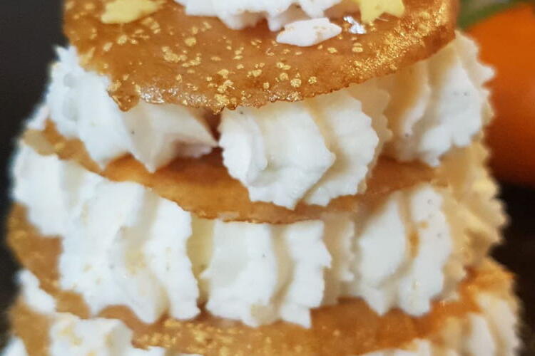 Assembly of the log. Unroll your sponge cake. Spread 2/3 of the cream in an even layer over the cake. Then spread the cranberry filling. Sprinkle with half of the nougatine. Roll your cake up. Then cover it with the remaining mascarpone cream and the rest of the nougatine.