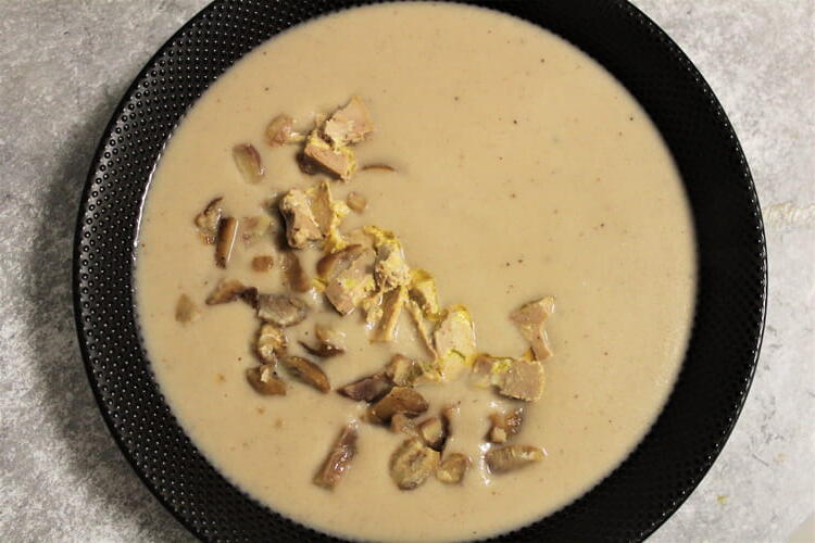 Place the vegetables and the chestnuts (keep 4 chestnuts for garnish) in the bowl of the mixer, cover with water to the appropriate level, and start the creamy soup program.