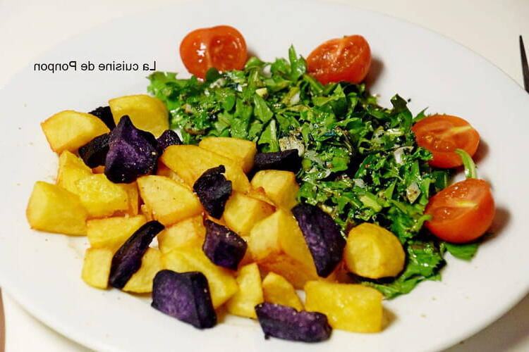 Cook the potato pieces in the fryer until they are golden. Remove them onto paper towels and salt them. Serve a portion of fried potatoes and a portion of salad decorated with halved cherry tomatoes on each plate.