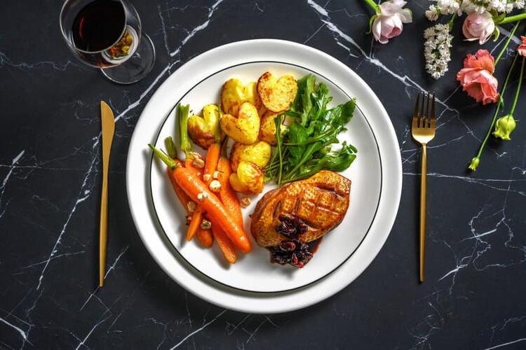 To finish, just before serving, add the arugula to the mixing bowl and mix. Serve the arugula, potatoes, and glazed carrots on the plates. Sprinkle the carrots with hazelnuts. Place the duck breast beside it. Drizzle with honey and cranberry sauce.