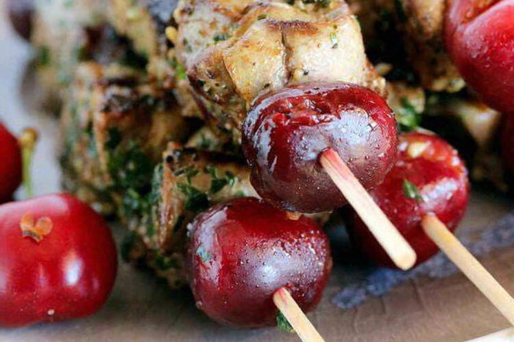 Prepare the rabbit liver skewers. Thread the pieces of liver onto the wooden skewer, alternating with the cherries. Place the skewers on a plate and sprinkle with cornstarch on both sides.