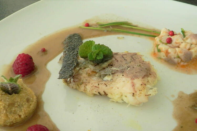 To finish, place the fish fillet in the center of each plate, add some grilled scales and the crispy skin on top. Around the edge of the plate, pour the sauce, add the potato toasts, and the tartare garnished with a few aromatic leaves.
