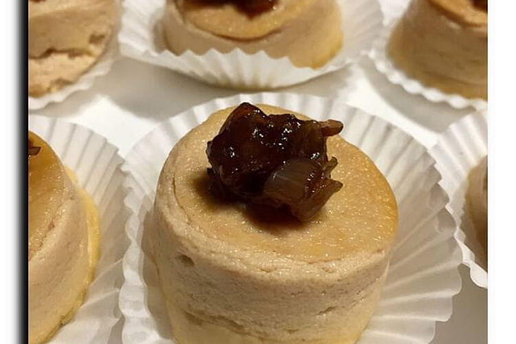 Preparation of the flans: Preheat the oven to 160 °C. Chop the pâté in a food processor. Add the eggs, cream, salt, and pepper. Fill the silicone mold. Cover the flans with parchment paper. Bake for 20 minutes. After 20 minutes, you can poke a flan with a toothpick, which should come out clean. Allow to cool slightly, then place the mold in the refrigerator to chill the flans; they will be easier to unmold. Carefully unmold, place them in small cups, and arrange them on the serving platter.