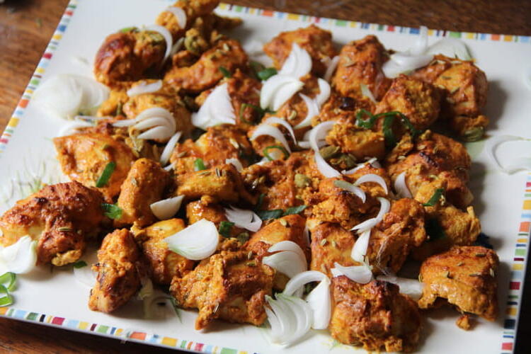 To finish, grill the marinated chicken gently on the barbecue. Serve with a young greens salad and a dressing.