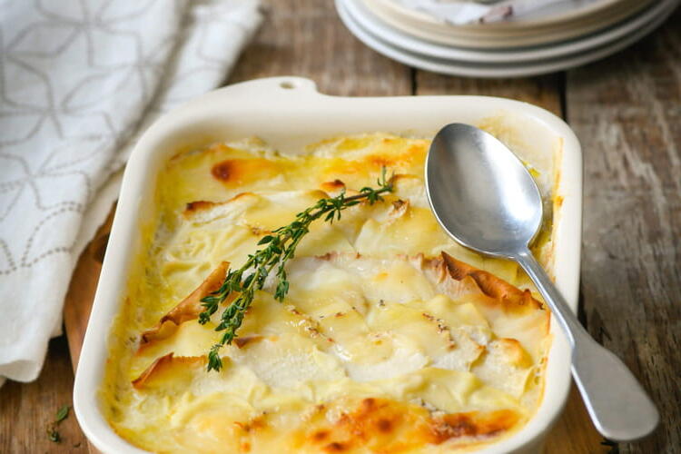 Mix the cream and milk with nutmeg, salt, and pepper. Pour it over the vegetables. Sprinkle with thyme and bake for 50 minutes. When the tip of a knife easily pierces the vegetables and the top is golden brown, take it out of the oven and serve immediately.