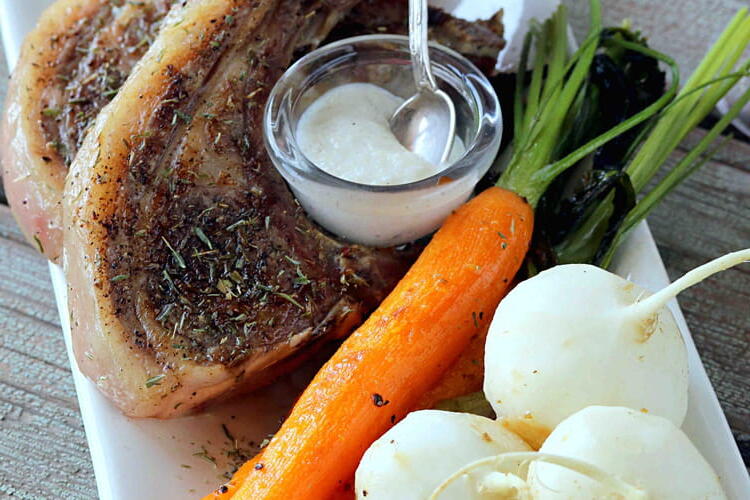 To finish, take the meat out 30 minutes before cooking. Melt the butter in a skillet over medium heat. Place the lamb and the peeled garlic cloves in the skillet and cook until the chops are golden brown on both sides. Serve immediately with garlic sauce and seasonal vegetables of your choice.