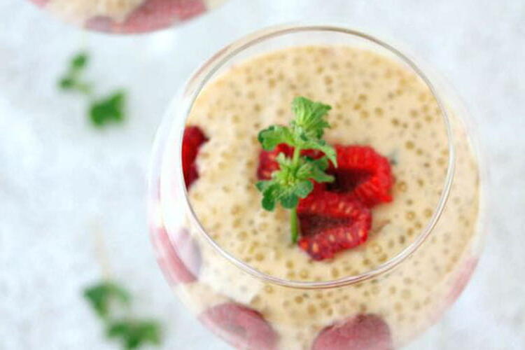 Prepare 4 nice glasses. Coarsely crush some raspberries at the bottom of the glasses. Add the tapioca pearls to the glasses. Decorate nicely with fresh raspberries halved.