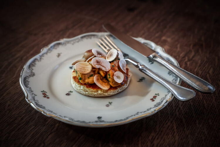 In a hot skillet, start by browning the lamb sweetbreads in foaming butter.