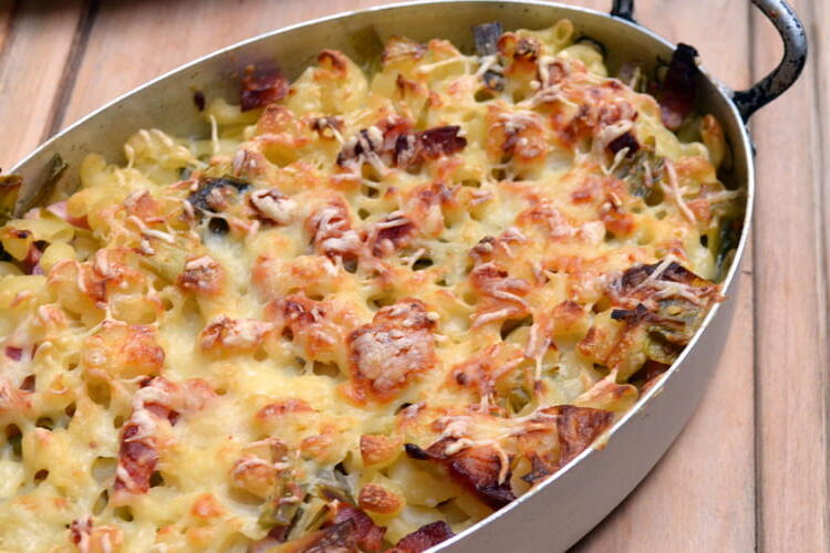 When the leeks are cooked, add them to the béchamel sauce. Stir everything, then add the pasta and the bacon.