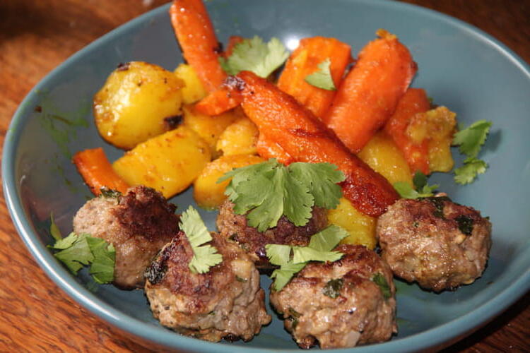 Mix the ground meats, shallot, ginger, coriander, egg, breadcrumbs, and spices in a mixing bowl. Season with salt and pepper. Work everything with your hands to achieve a homogeneous mixture. Form meatballs and place them in a dish (between 16 and 18). Set aside in the refrigerator for 1 hour.