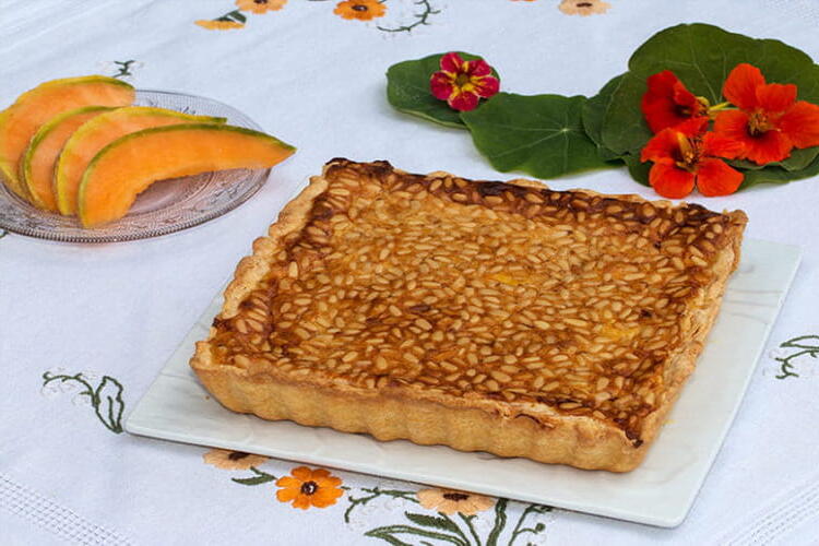 Preheat the oven to 180°C. Line a baking mold; here I used a square silicone mold. Beat the eggs with the cream and a pinch of lavender flowers. Add the candied melon and mix well. Pour the mixture over the pastry base. Sprinkle the entire mixture with pine nuts. Bake for 35 minutes. Halfway through cooking, reduce the temperature to 160°C.