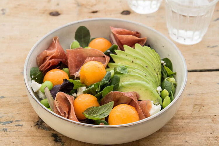 Recipe for Melon, Feta, Avocado, Edamame, and Cured Ham Salad