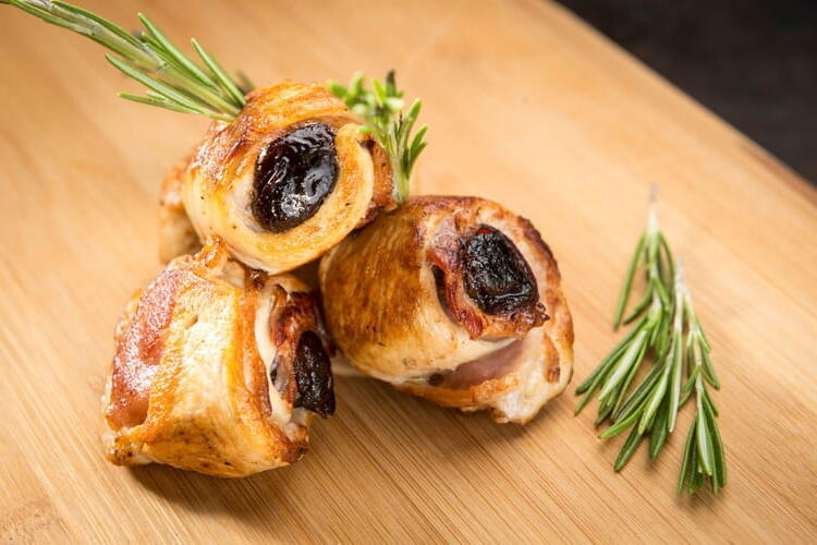 Make a strip with the chicken and double it with bacon. Place a prune at the end of the strip and roll it all up to make a small roulade. Finally, secure everything with a sprig of rosemary and set aside in the fridge.