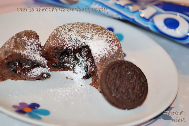 Fill the molds halfway with batter, then place a cookie and a piece of dark chocolate in the center. Distribute the remaining batter. Bake the fondants in the oven for 15 minutes.