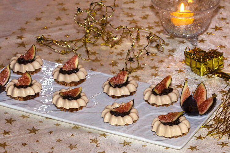 To finish, fill the cavities with fig chutney. Decorate the mini panna cotta with a thin slice of fresh figs and enjoy.