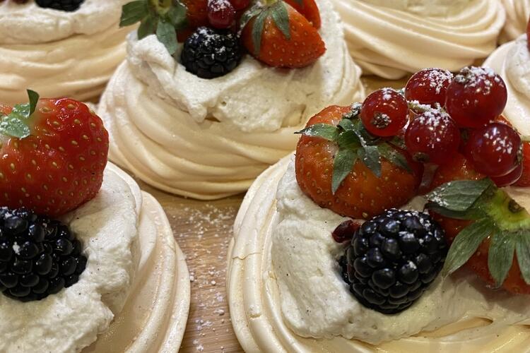 A preparation of melting mini pavlovas. A simple and fresh recipe, filled with red fruits.