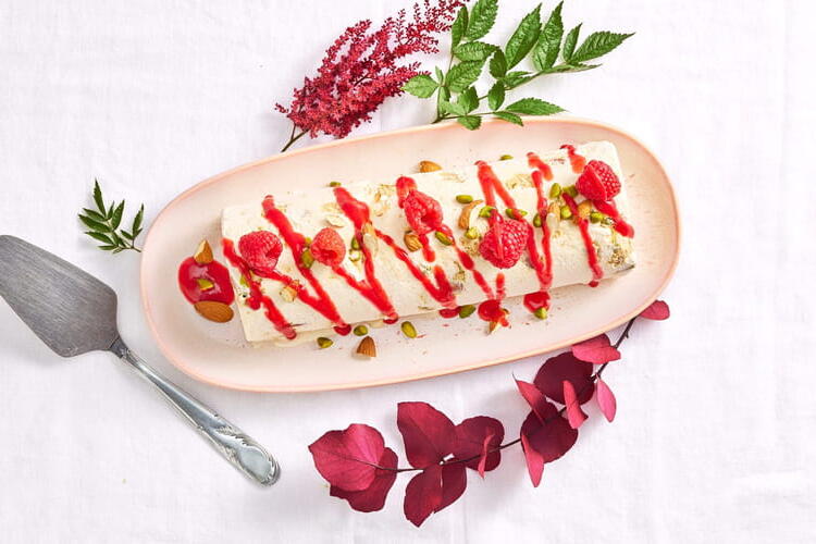 Blend the pink pralines into a powder. Heat the milk, butter, and vanilla extract to 60° and set aside.