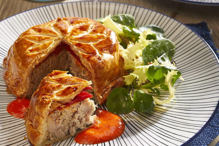 In the shortcrust pastry, cut out 2 circles of 10 cm and in the puff pastry, 2 of 14 cm. In the center of the 10 cm discs, place a tablespoon of parsley mixture. Add the slices of tuna, on which you will place a piquillo pepper flat. Cover everything with the 14 cm discs. Pinch the two pastries together to seal them well. Using a brush, glaze the entire surface with the egg yolk mixed with a small amount of water. Decorate the top as desired, and place in the refrigerator for 15 minutes.