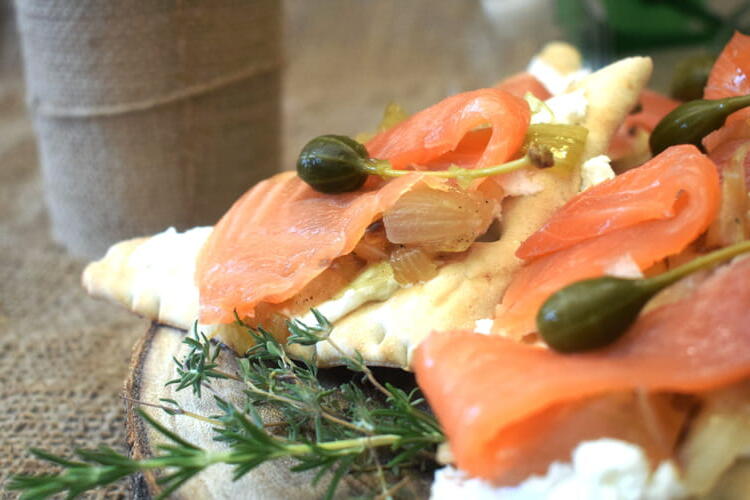 Finally, spread them with fresh cheese, add the onion compote, thin slices of salmon, and finish with a caper. Keep refrigerated until serving.