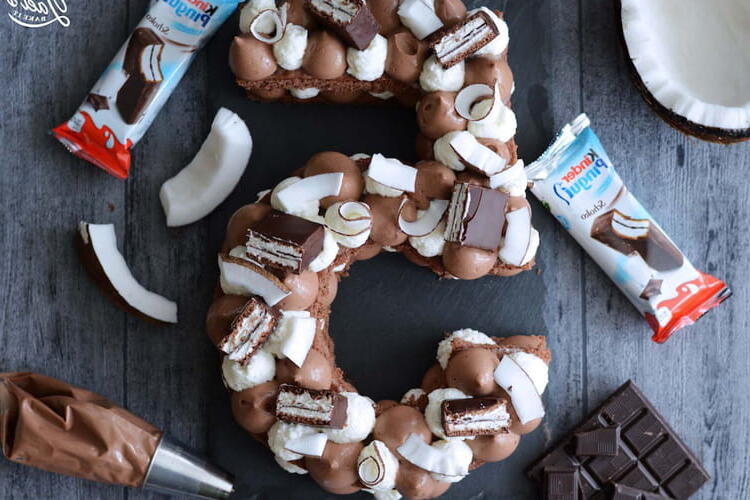 A light mousse made with coconut milk and a melting chocolate cream on a soft cocoa sponge cake, a new idea for a Number Cake!