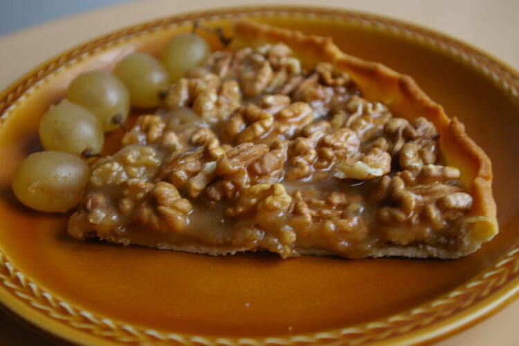 To finish, top the tart with walnut halves. Drizzle with warm soft caramel. Let it cool before serving.