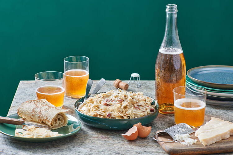 To finish, reheat the pasta in the microwave. Pour in the sauce and mix. Sprinkle with grated Parmesan cheese and serve with a dry, full-bodied cider.