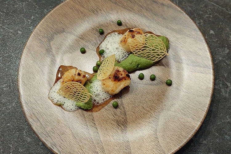 Pea mousse and seared scallops with Madeira, a perfect recipe for a festive meal.