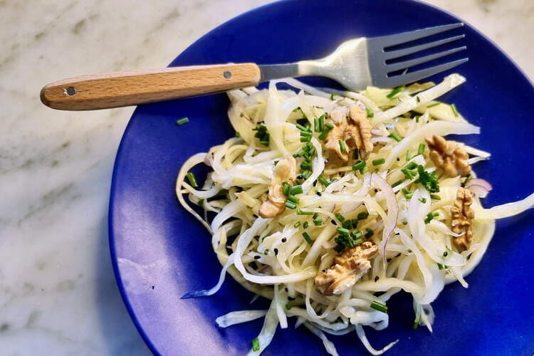 White cabbage is rarely considered in salads. A vegetable often consumed in the eastern regions and in Anglo-Saxon countries, it is sometimes used in a simple salad or marinated as shown here.