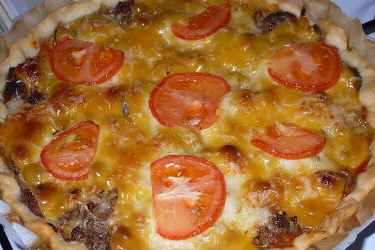 Place this mixture on the pie and then cover with cheddar cheese and Gruyère.