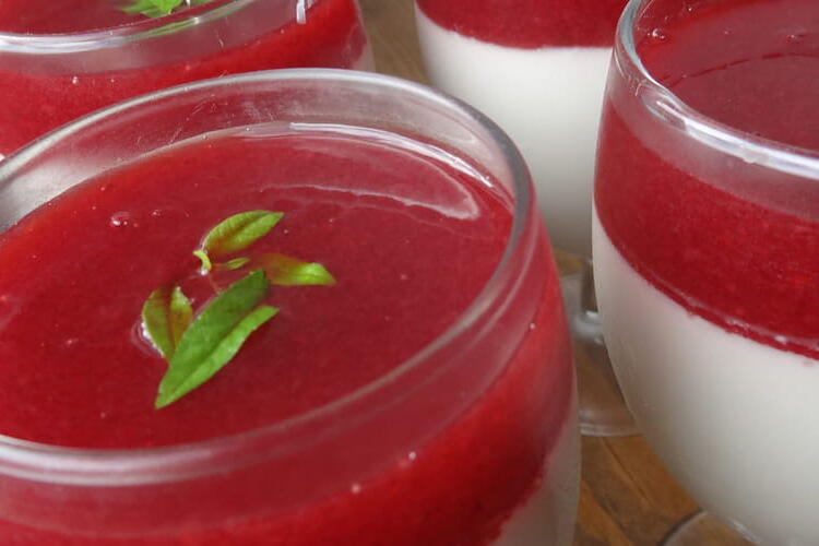 Very easy and quick to prepare dessert, remember to make it in advance so it has time to set. It can be made with any plant-based drink and fruit sauce (for example: coconut + mango sauce; almond + chestnut cream…). For this photo, it's soy and strawberry sauce with a small leaf of verbena for decoration. To make a homemade fruit sauce, cook 400 g of fruit with 3 tablespoons of sugar and 2 tablespoons of lemon juice.