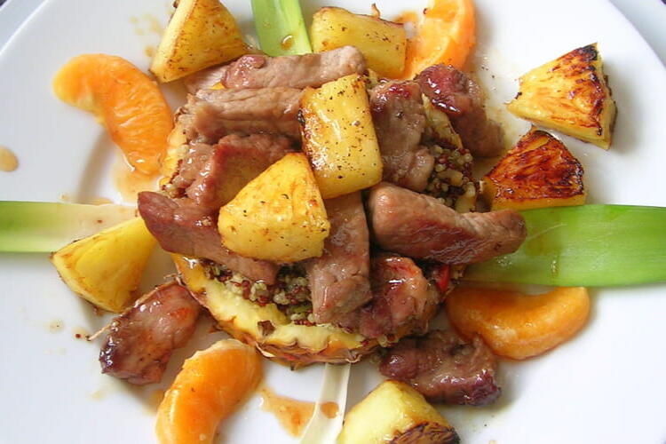 Cut 4 slices of pineapple about 1.5 cm thick. Remove the pulp while keeping the skin circles intact. Cut the pulp into pieces, removing the woody core. Sauté the pineapple and grapefruit segments in a pan with butter. Drain the quinoa, add the corn and the pepper-onion mixture. Season with pepper to taste.
