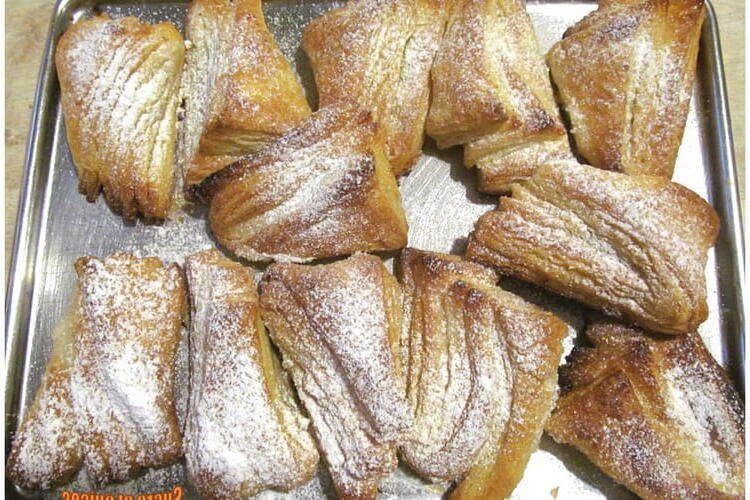 Roll out the dough into a rectangle about 5mm thick. Sprinkle one third of the center dough with powdered sugar, then fold over the left third of dough. Sprinkle its surface with sugar as well, then fold over the right third of dough. At this stage, you should have used half of the sugar. You should have a piece of dough with 3 layers of dough and 2 layers of sugar.