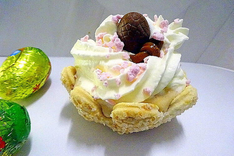 Whip the mascarpone with the yogurts, sugar, and spread. Fill each mini pastry shell with the mixture. Top with whipped cream, a drizzle of caramel, and a praline chocolate egg. Enjoy immediately and most importantly, have a great time.