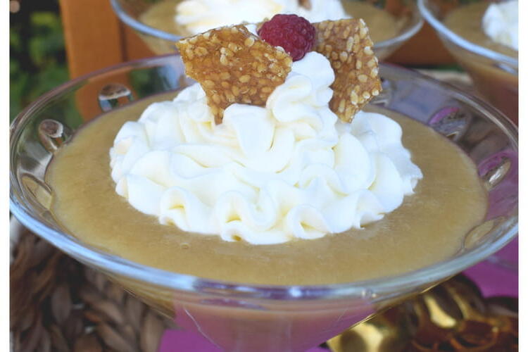 To finish, whip the cream with the mascarpone and powdered sugar. Put it in a piping bag. Distribute the compote into cups, top with the whipped cream, and decorate with a raspberry and pieces of nougat.
