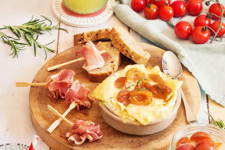 To finish, bake for 15 minutes. Spread the fruit and serve with slices of cured ham and toast.