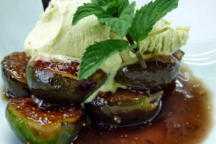 To finish, in a shallow dish, carefully place your figs and pour a bit of the sauce from the pan over them. Make a scoop of vanilla ice cream and place it on top of the figs. Add a mint leaf and serve immediately.