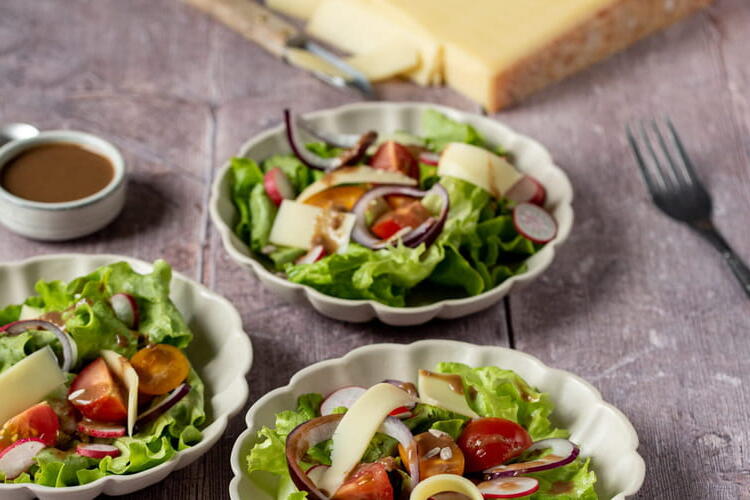 Discover this delicious spring salad with thin slices of cheese, accompanied by a tahini and honey dressing.