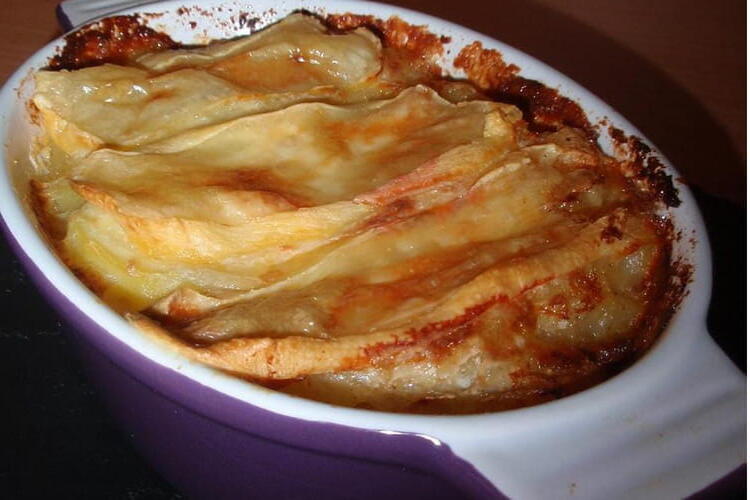 Cook the potatoes for 20 minutes with the skin on. Peel them and cut into slices or cubes. Slice the onion and sauté it in butter. Add the diced bacon and pour in the white wine. Let it cook for 5 minutes and season. Spread half of the potatoes in a greased dish or individual ramekins. Cover with the onion and bacon mixture, then add the remaining potatoes. Top with fresh cream and then arrange the cheese cut in half lengthwise or in thick slices. Bake for 20 minutes at 200 °C until the cheese is completely melted and slightly golden.