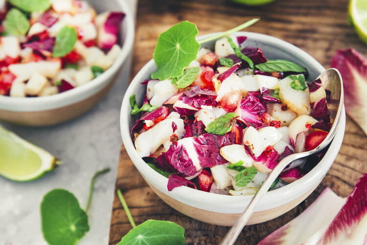 Mix the diced scallops, pomegranate seeds, and mint with the red endives. Season with salt and freshly ground pepper.