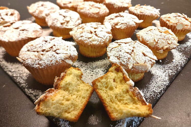 Pour the batter into silicone muffin molds (or with paper liners). Fill the molds to a maximum of 3/4 full. Sprinkle with sliced almonds.