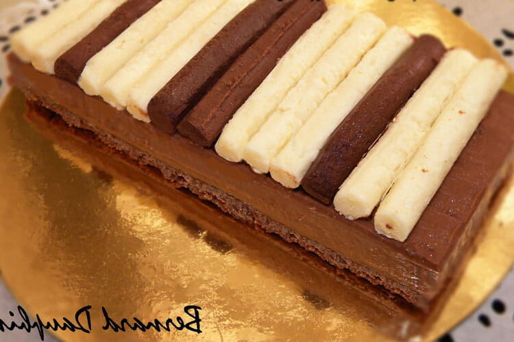 To finish, remove the rings from the creamy mixture. Pipe alternating lines of dark chocolate ganache and white chocolate mousse onto the milk chocolate cream, simulating the keys of a piano. Reserve in the fridge until serving.