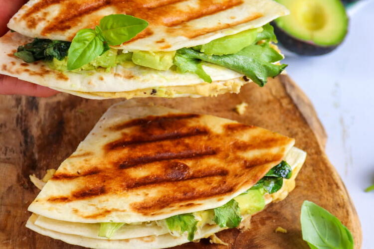 A recipe for tortillas in the style of quesadillas with hummus, chicken, and avocado. Credits: Lucie Brisotto - Healthy Food Creation.